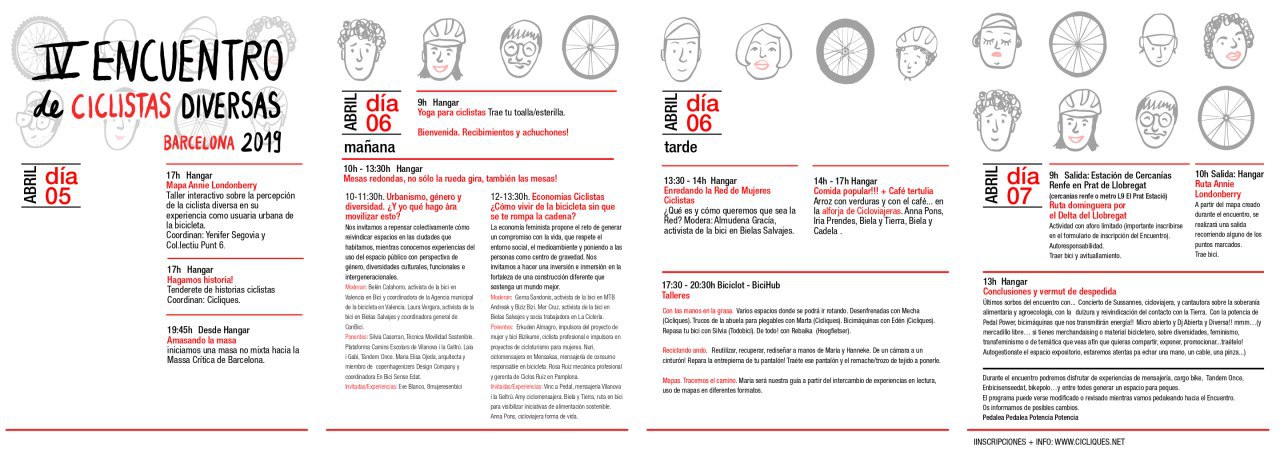Encuentro no mixto entrono a la bicicleta, la perspectiva de género y la diversidad, para disfrutar de mesas redondas, actividades como la elaboración de mapas emocionales, yoga, talleres de mecánica, reutilización de materiales ciclistas y experiencias de mensajería, cargo bike, Tandem Once, Enbicisenseedat… Programa y más info en https://www.facebook.com/cicliques/Organizado el colectivo barcelonés Cicliques, junto a otros colectivos ciclistas como Bielas Salvajes o la Red de Mujeres Ciclistas.